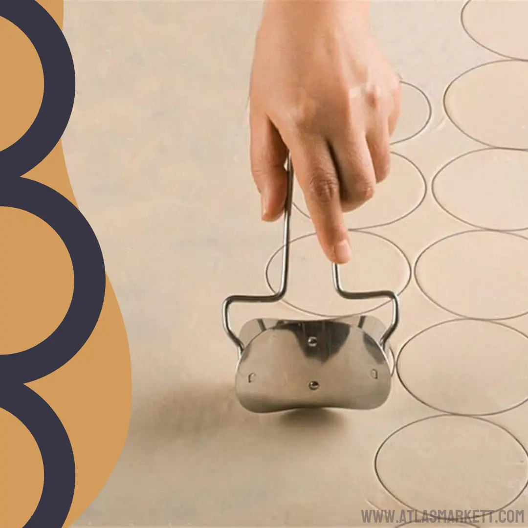 Perfect manual puri cutter roller for calzone, dumpling, empanada, pie, ravioli, pierogi, pot sticker, breads, cookies, biscuits, and more.