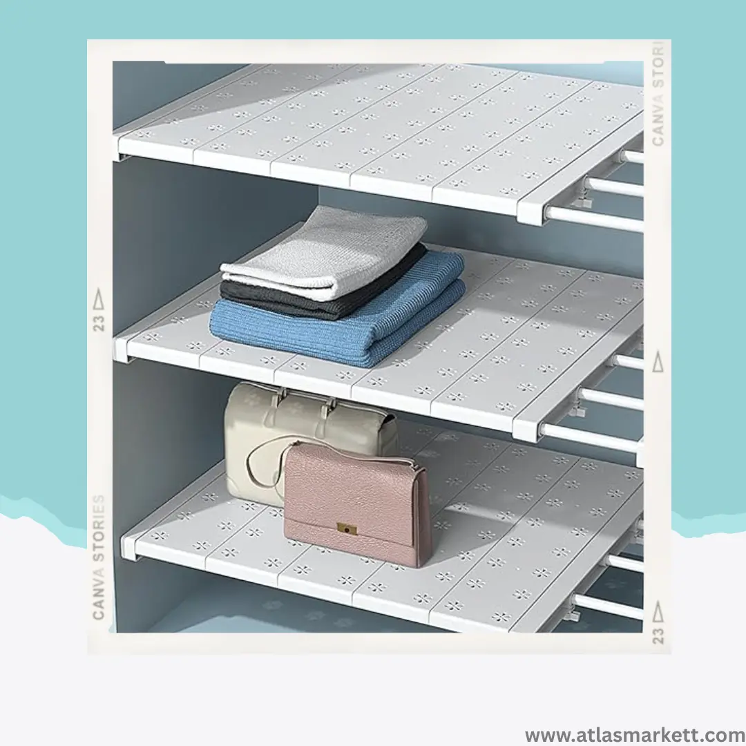 Maximize your storage space with the Expandable Wardrobe Shelf Organizer, a versatile and durable solution for keeping your wardrobe, cabinet, or closet neatly organized. Designed as a plastic closet organizer, this adjustable shelf easily fits various wardrobe sizes and provides a practical way to divide and arrange clothes, shoes, towels, bedsheets, pillows, books, and decor items.