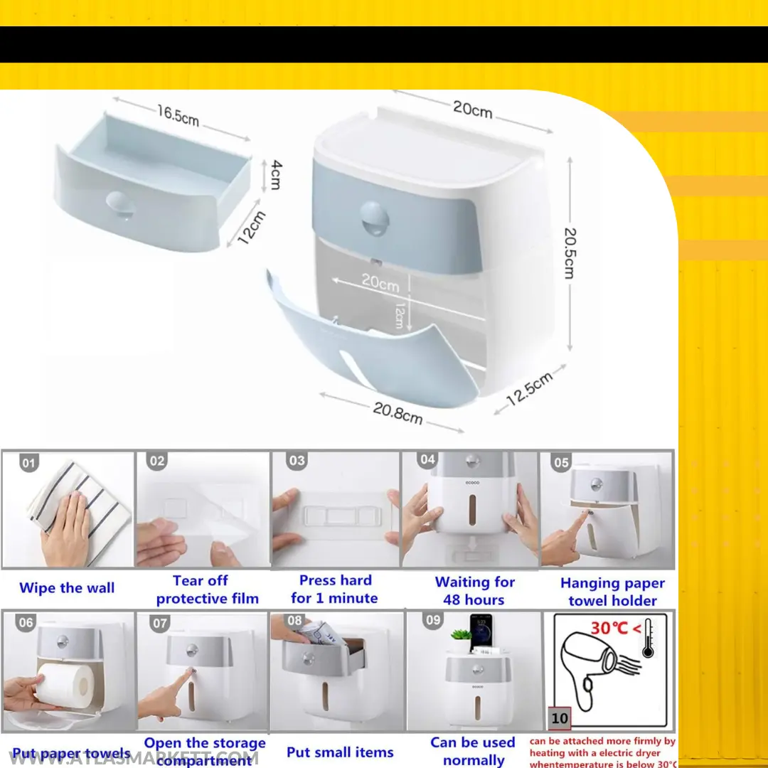 This self adhesive toilet paper holder installs easily without drilling, ensuring a clean and damage-free wall finish. The built-in storage box and top shelf add convenience. You can keep soaps, lotions, or small decorative items within reach.